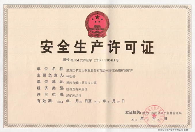 近日,黑龍江多寶山銅業(yè)股份有限公司取得安全生產(chǎn)許可證。